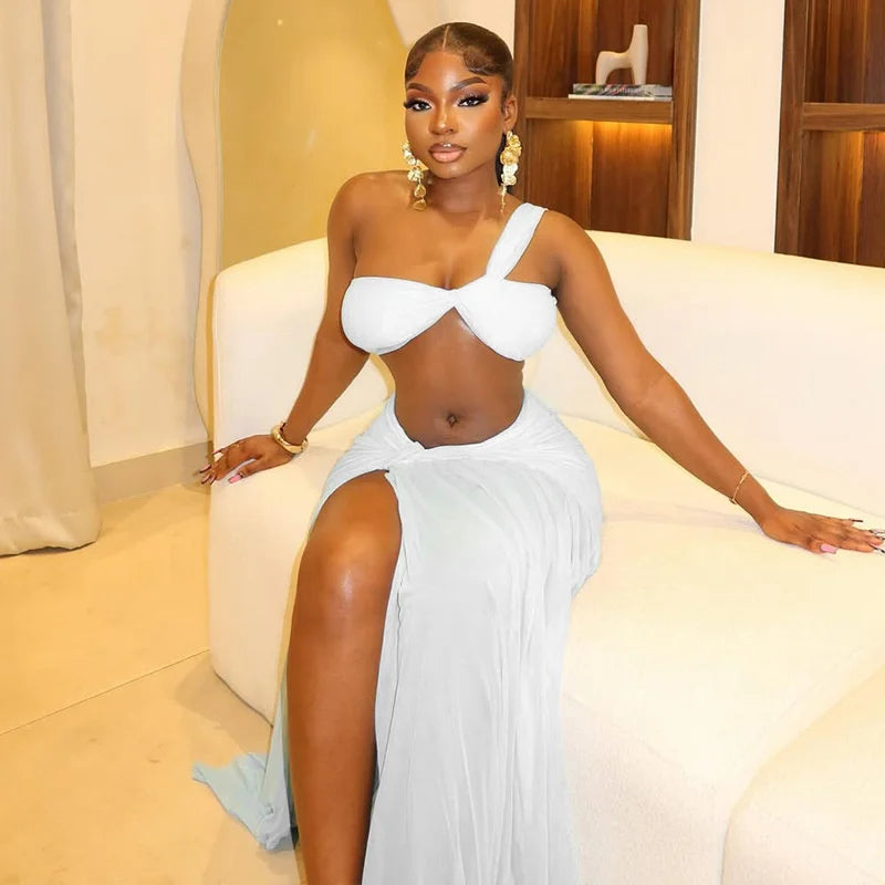 Mesh Ruched Sexy Club Outfits Woman 2026 Birthday Strapless Crop Top and High Split Long Skirt 2 Piece Set Conjuntos Femininos