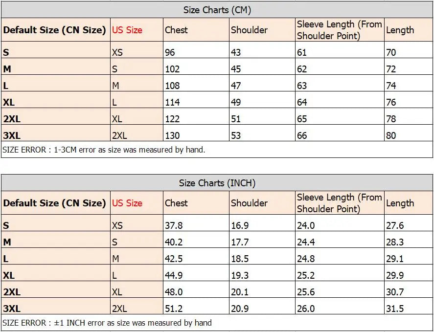 size_info: {"sizeInfoList":[{"length":{"cm":"S","inch":"S"},"size":"CN S(US XS)","vid":-49},{"length":{"cm":"M","inch":"M"},"size":"CN M(US S)","vid":-50},{"length":{"cm":"L","inch":"L"},"size":"CN L(US M)","vid":-51},{"length":{"cm":"XL","inch":"XL"},"size":"CN XL(US L)","vid":-52},{"length":{"cm":"2XL","inch":"2XL"},"size":"CN 2XL(US XL)","vid":-53},{"length":{"cm":"3XL","inch":"3XL"},"size":"CN 3XL(US 2XL)","vid":-54}]}