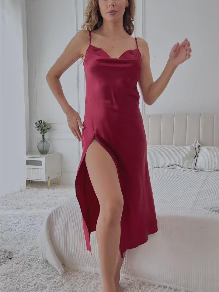 Women's Elegant Solid Satin Nightdress Slim Strap High Slit Lightweight Luxurious Loungewear
